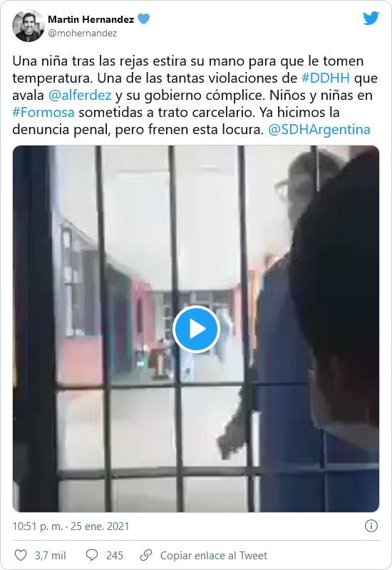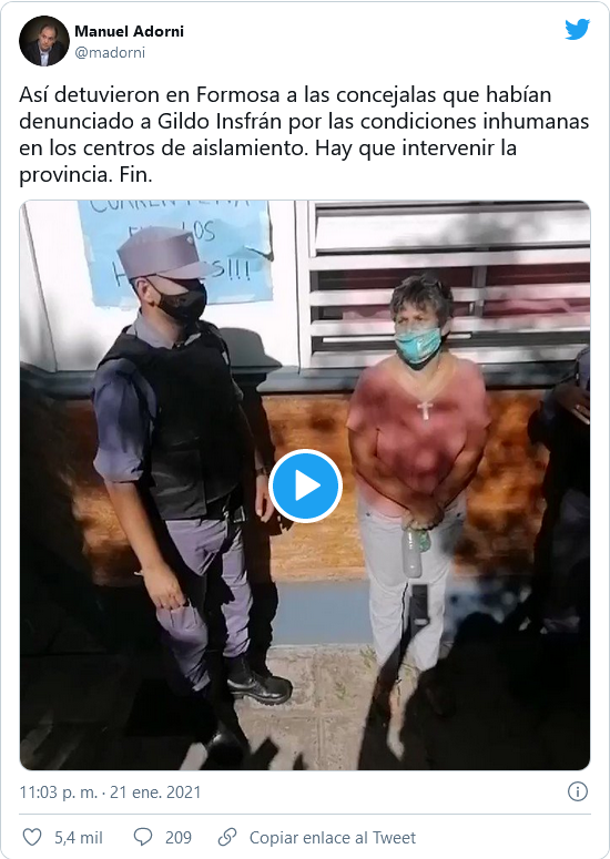 (28 enero 2021) En Formosa, provincia fronteriza del norte argentino. La provincia tiene uno de los mayores niveles de dependencia clientelar (Nota: esto es masonería, entre ellos se colocan laboralmente) del país, con una pobreza estructural extrema, y su gobernador ha implementado medidas dictatoriales con la excusa de la lucha contra el Covid. Estas medidas incluyen la extracción compulsiva de ciudadanos de su casa sin órdenes judiciales, su reclusión en “centros de aislamiento”, en pésimas condiciones sanitarias, y de violencia.