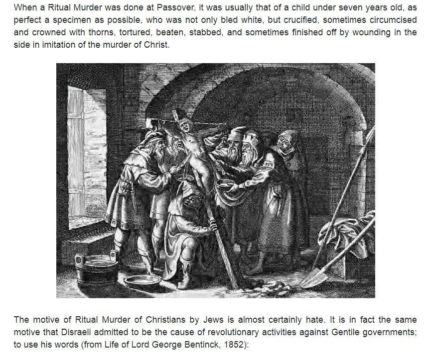 «El asesinato ritual judío es un crimen perpetrado en contra de gentiles a manos de los judíos, para hacer rituales religiosos.