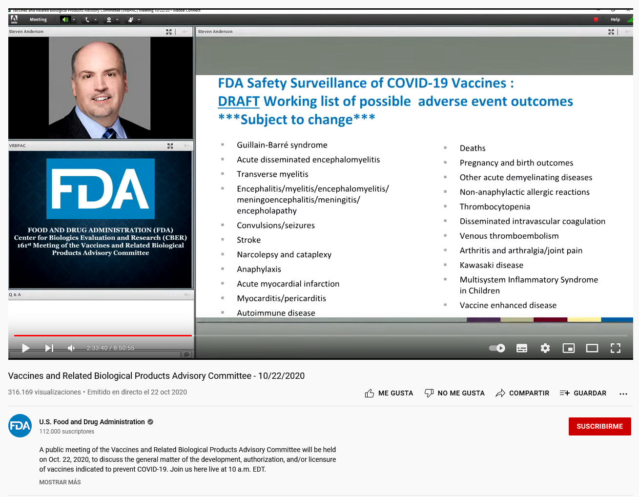 La Administración de Drogas y Alimentos de EE.UU. (FDA) tiene subido a Youtube un vídeo de 8:50:55sg (casi nueve horas) donde, dos meses antes de la vacunación masiva, discutía sobre su licitación.
