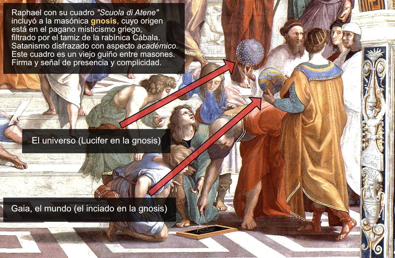 El cuadro, muy famoso, es de Raphael, ‘Scuola di Atene’ (1509-1511). Es muy estimado por la gente de la secta de la masonería (ejemplo en enlace de la «sabiduría/conocimiento» de estos pobres insensatos).